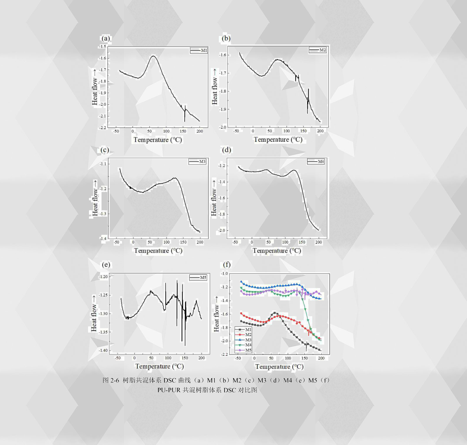 從PU-PUR共混樹(shù)脂的DSC曲線(xiàn)對(duì)其固化行為進(jìn)行分析。從M1樹(shù)脂的DSC曲線(xiàn)2-6(a)上看到,曲線(xiàn)在35.41-86.16℃之間出現(xiàn)了一個(gè)明顯的放熱峰,這就是M1樹(shù)脂的固化反應(yīng)峰,其峰值為59 .66℃。從M2樹(shù)脂的DSC曲線(xiàn)2 - 6(b)上看到,曲線(xiàn)在45.16-120.16℃之間出現(xiàn)了一個(gè)明顯的放熱峰,這就是M2樹(shù)脂的固化反應(yīng)峰,其峰值為73.66℃。從M3樹(shù)脂的DSC曲線(xiàn)2-6(c)上看到,曲線(xiàn)在94.58-138.25℃出現(xiàn)了一個(gè)明顯的放熱峰,這就是M3樹(shù)脂的固化放熱峰,其峰值為125.08℃。從M4樹(shù)脂的DSC曲線(xiàn)2-6(d)上看到,曲線(xiàn)在98.58-140.83℃出現(xiàn)了一個(gè)明顯的放熱峰,這就是M4樹(shù)脂的固化放熱峰,其峰值為126.16℃。從M5樹(shù)脂的DSC曲線(xiàn)2-6(e)上看到,曲線(xiàn)出現(xiàn)了兩個(gè)較大的放熱峰,其中第二個(gè)較大的放熱峰位于96.50-138.08℃之間,其峰值為116.75℃。通過(guò)不同共混樹(shù)脂的DSC曲線(xiàn)對(duì)比2-6(f)可以看出,聚脲的加入使得共混樹(shù)脂放熱峰朝著較高溫度移動(dòng),而通過(guò)M3、M4樹(shù)脂的曲線(xiàn)可以看出,當(dāng)聚脲含量占到共混樹(shù)脂的50%以上時(shí),共混樹(shù)脂的固化峰值變化不大。從共混樹(shù)脂的DSC曲線(xiàn)和樹(shù)脂流變測(cè)試結(jié)果分析得出,樹(shù)脂DSC曲線(xiàn)的峰值和樹(shù)脂流變粘度-溫度曲線(xiàn)轉(zhuǎn)變點(diǎn)的結(jié)果大致符合,因此表2-3能夠作為樹(shù)脂共混體系的最佳固化溫度和時(shí)間使用。
