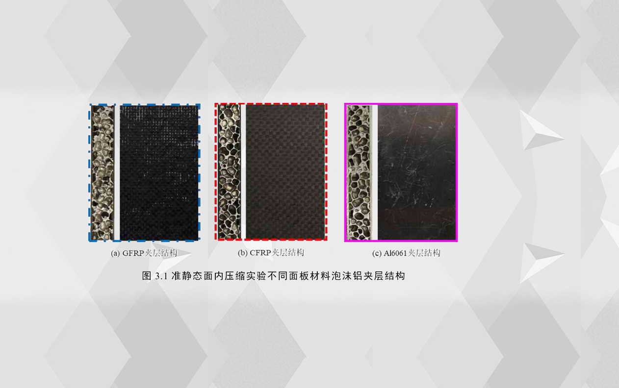 泡沫鋁夾層結構在汽車應用中所承載的另一種典型工況為面內壓縮,例如泡沫鋁填充引擎蓋、側門等,例如泡沫鋁填充的前縱梁,當汽車發(fā)生正面碰撞交通事故時,當沖擊速度較大時,引擎蓋、側門會發(fā)生較大的擠壓面內變形,而夾層結構在面內壓縮工況下的失效機理和吸能特性也是相當復雜的,為了推動夾層結構在汽車上的應用,對泡沫鋁夾層結構在面內壓縮工況下全面系統(tǒng)的研究是很有必要的。本章主要通過實驗的方法,揭示了不同配置的泡沫鋁夾層結構在準靜態(tài)面內壓縮工況下的結構響應機理、失效模式以及耐撞性能,得出何種配置的泡沫鋁夾層結構的耐撞性能更優(yōu),泡沫鋁夾層結構的配置參數主要包括面板材料、面板厚度、芯層高度和芯層密度。