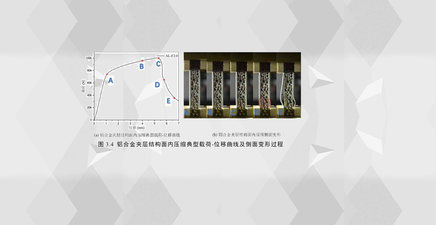 圖3.4(a)描繪了鋁合金夾層結(jié)構(gòu)在面內(nèi)壓縮下典型載荷-位移曲線(xiàn),其壓潰過(guò)程大體可以分為三個(gè)階段,O-A彈性階段,此階段結(jié)構(gòu)處于彈性變形,載荷與位移的關(guān)系為線(xiàn)性增長(zhǎng);A-C塑性階段,在此階段結(jié)構(gòu)面板受到較大的壓力而產(chǎn)生塑性變形,載荷與位移仍近似呈線(xiàn)性增長(zhǎng)趨勢(shì),只是載荷增長(zhǎng)幅度遠(yuǎn)小于彈性階段增長(zhǎng)幅度;C之后屬于后屈曲階段,由于在此階段面板發(fā)生嚴(yán)重屈曲變形,并且面板與芯層之間的膠層出現(xiàn)大面積失效,這導(dǎo)致夾層結(jié)構(gòu)的承載能力大大降低,此外,由于泡沫芯層壓縮的效果,在面板失穩(wěn)之后夾層結(jié)構(gòu)仍有較弱的承載能力,并未完全失去承載能力,圖3.4(b)為此試件在圖3.4(a)各點(diǎn)時(shí)刻側(cè)面面板與芯層泡沫的變形圖。