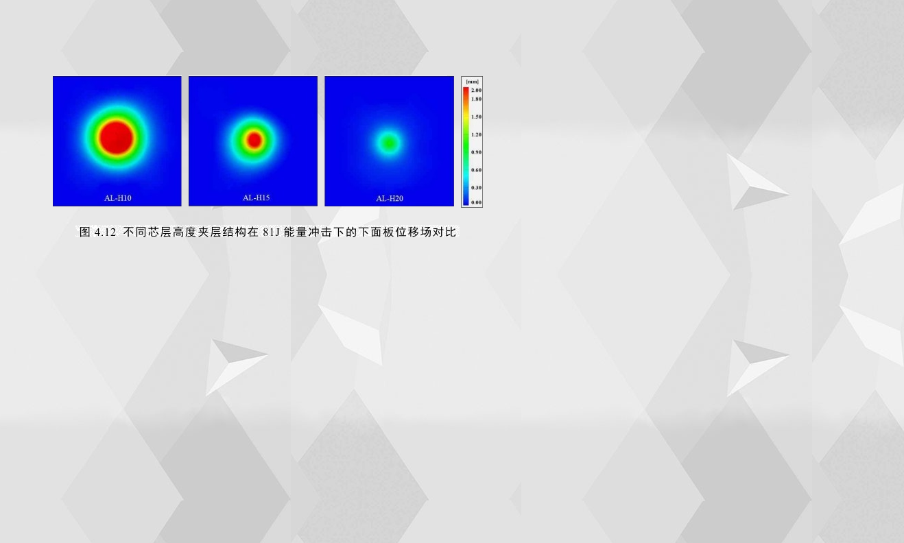 圖4.12比較了三種芯層高度的夾層結(jié)構(gòu)在81J能量沖擊下的下面板位移場(chǎng),可以發(fā)現(xiàn),位移場(chǎng)以沖擊點(diǎn)為中心呈環(huán)形分布,且隨著芯層厚度的增加,下面板的最大位移量減小,并且變形面積逐漸減少。