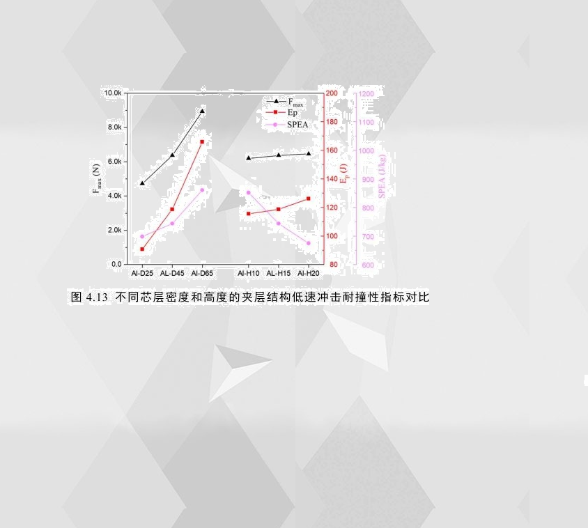 根據(jù)各配置的試件在穿透能沖擊下的載荷-位移曲線,計算得出各耐撞性指標(biāo)比較如圖4.13所示,可以看出,隨著夾層結(jié)構(gòu)芯層密度的上升,其耐撞性能明顯提高,芯層密度從0.25g/cm3增加到0.65g/cm3,夾層結(jié)構(gòu)的初始峰值載荷增加89%,穿透吸能提高82%,比穿透能提高23%;對芯層高度而言,試件的芯層高度從10mm增加到20mm,其初始峰值載荷和穿透吸能均只有小幅增加,特別是初始峰值載荷,增加的幅度基本忽略不計,而其比穿透能反而明顯降低,大約下降了25%。